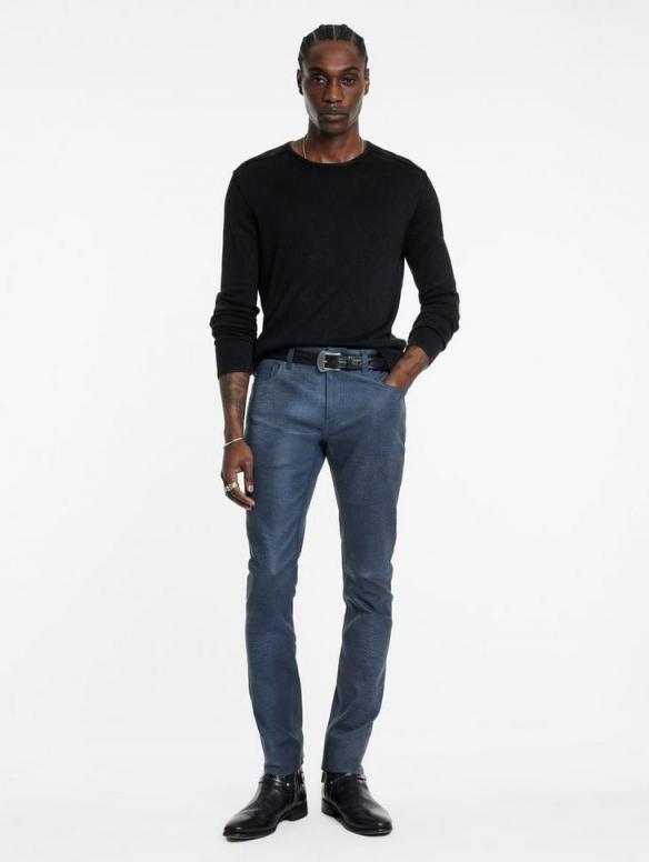 For our Fall ‘24 collection, leather asserts itself, reshaping rebellion with The Rocker skinny jeans. Expertly crafted from stretch skin bonded with spandex, they feature a sanded and distressed finish that emulates the timeless appeal of denim. Melding rugged aesthetics with the sleek agility of lamb leather, The Rocker jeans are constructed to move as you do, each detail championing the spirit of modern defiance. 100% Lamb Leather Professional Dry Clean By Leather Expert Skinny Fit Five Pockets Zip and Button Closure Sanded and Distressed Technique Measurement: Waist: 33.5″, Hip: 40.5”, Inseam: 33″